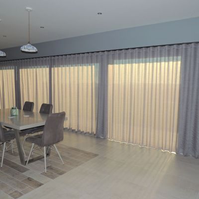 In total, 37 metres of double-width sheer fabric was used, and a combined length of 21 metres of Metropole. A huge relief once all installed!